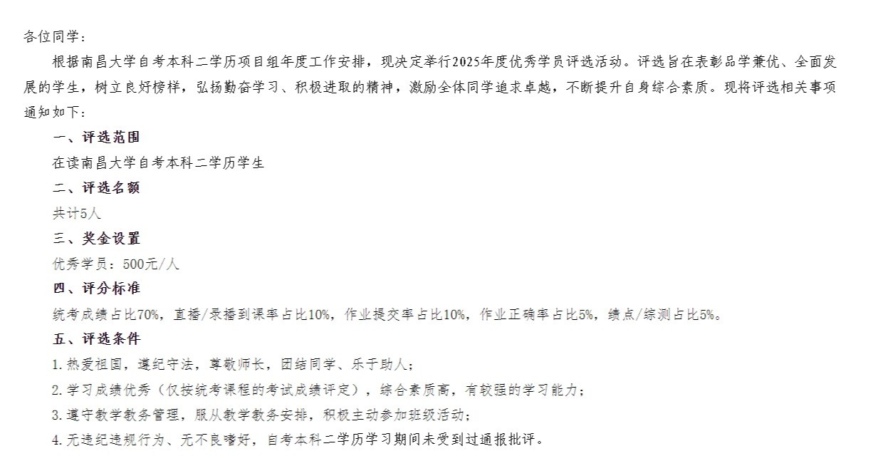 关于做好2025年度自考本科二学历优秀学员评...各位同学:根据南昌大学自考本科二学历...